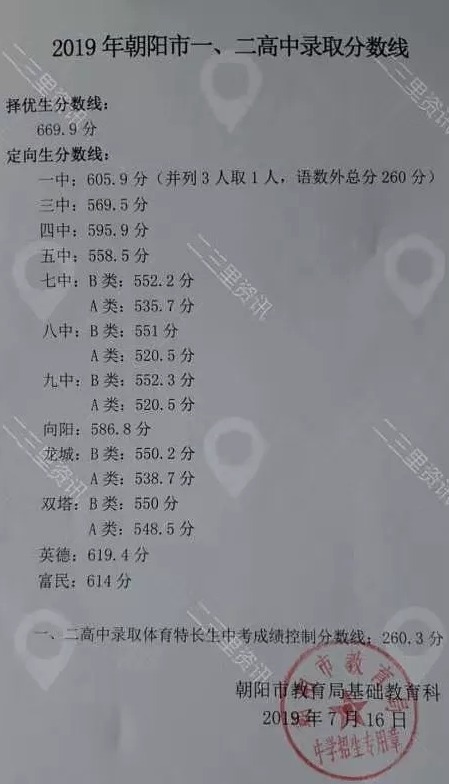 朝阳市2019年一、二高中录取分数线公布 什么是A类、B类?政策加分项有哪些?问题解答