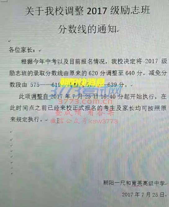 育英高中录取分数调整说明:励志班分数线提高20分,最低分调至640分;减免段由575-619分调整为575-639分;此项调整自2017年7月25日16:40开始执行,此时间点前已正式报名者均有效。/育英高中