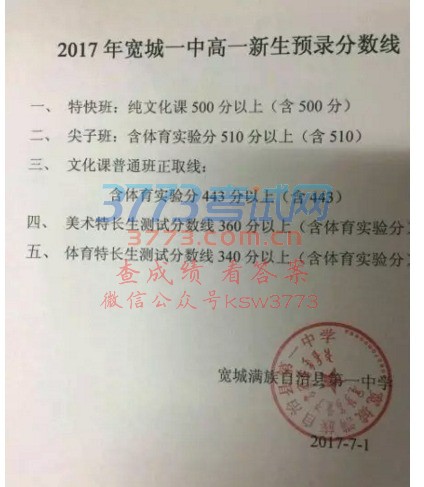 2017宽城一中高一新生预录分数线