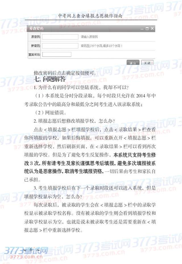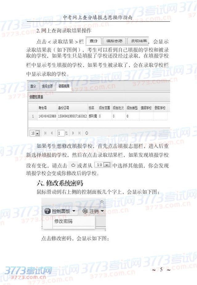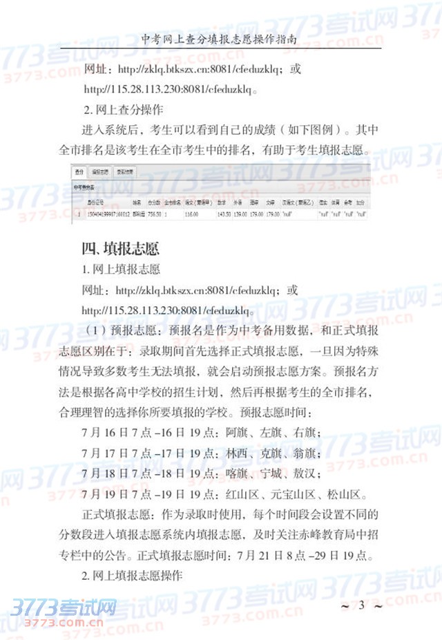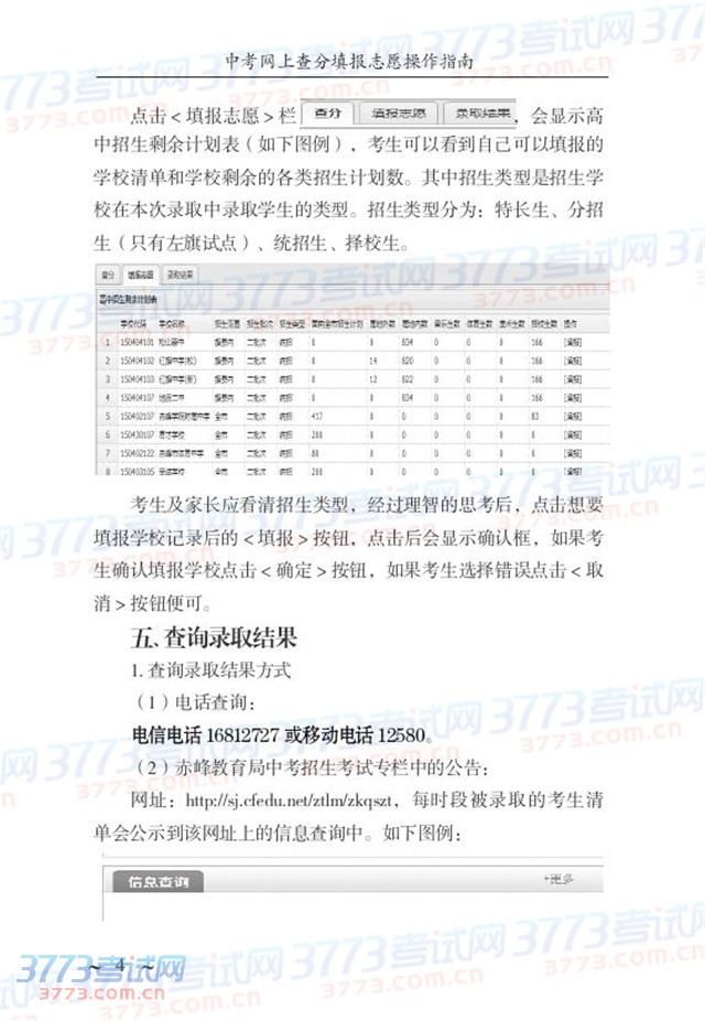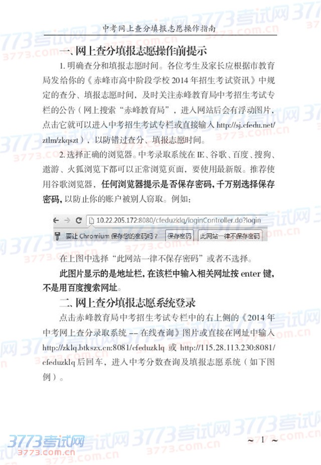 ~ 1 ~中考网上查分填报志愿操作指南一、网上查分填报志愿操作前提示1. 明确查分和填报志愿时间。各位考生及家长应根据市教育局发给你的《赤峰市高中阶段学校2014 年招生考试资讯》中规定的查分、填报志愿时间,及时关注赤峰教育局中考招生考试专栏的公告(网上搜索“赤峰教育局”,进入网站后会有浮动图片,点击它就可以进入中考招生考试专栏或直接输入http://sj.cfedu.net/ztlm/zkqszt),以防错过查分、填报志愿时间。2. 选择正确的浏览器。中考录取系统在IE、谷歌、百度、搜狗、遨游、火狐浏览下都可以正常浏览页面,要使用最新版。推荐使用谷歌浏览器,任何浏览器提示是否保存密码,千万别选择保存密码,以防止你的账户被别人窃取。例如:在上图中选择“此网站一律不保存密码”或者不选择。此图片显示的是地址栏,在该栏中输入相关网址按enter 键,不是用百度搜索网址。二、网上查分填报志愿系统登录点击赤峰教育局中考招生考试专栏中的右上侧的《2014 年中考网上查分录取系统-- 在线查询》图片或直接在网址中输入http://zklq.btkszx.cn:8081/cfeduzklq 或http://115.28.113.230:8081/cfeduzklq 后回车,进入中考分数查询及填报志愿系统(如下图例)。~ 2 ~中考网上查分填报志愿操作指南1. 登录系统输入考生身份证号和用户密码(该密码是中考报名时在报名系统中输入的密码)。对于忘记密码的考生应在查分之前知道自己的密码,并且不可向外人泄露,凡是因为考生及家长外泄密码导致的一切后果,责任自负。市中招办会在查分之前让所有考生修改自己的密码,要求必须是学生及家长修改,并且要记住,不允许教师参与。输入身份证号和密码后点击< 登陆> 按钮,进入系统。一定要看清楚中考录取公告,填报志愿期间只允许公告中的最高分到最低分的考生进入系统,其他人员是进不去的。2. 报名志愿退出时,请考生一定要关闭浏览器,不要没有退出系统就离开,防止他人篡改你的信息。三、查分1. 查分方式(1)电话查分:电信电话16812727 或移动电话12580。(2)网上查分:~ 3 ~中考网上查分填报志愿操作指南网址:http://zklq.btkszx.cn:8081/cfeduzklq;或http://115.28.113.230:8081/cfeduzklq。2. 网上查分操作进入系统后,考生可以看到自己的成绩(如下图例)。其中全市排名是该考生在全市考生中的排名,有助于考生填报志愿。四、填报志愿1. 网上填报志愿网址:http://zklq.btkszx.cn:8081/cfeduzklq;或http://115.28.113.230:8081/cfeduzklq。(1)预报志愿:预报名是作为中考备用数据,和正式填报志愿区别在于:录取期间首先选择正式填报志愿,一旦因为特殊情况导致多数考生无法填报,就会启动预报志愿方案。预报名方法是根据各高中学校的招生计划,然后再根据考生的全市排名,合理理智的选择你所要填报的学校。预报志愿时间:7 月16 日 7 点-16 日19 点:阿旗、左旗、右旗;7 月17 日 7 点-17 日19 点:林西、克旗、翁旗;7 月18 日 7 点-18 日19 点:喀旗、宁城、敖汉;7 月19 日 7 点-19 日19 点:红山区、元宝山区、松山区。正式填报志愿:作为录取时使用,每个时间段会设置不同的分数段进入填报志愿系统内填报志愿,及时关注赤峰教育局中招专栏中的公告。正式填报志愿时间:7 月21 日8 点-29 日19 点。2. 网上填报志愿操作~ 4 ~中考网上查分填报志愿操作指南点击< 填报志愿> 栏,会显示高中招生剩余计划表(如下图例),考生可以看到自己可以填报的学校清单和学校剩余的各类招生计划数。其中招生类型是招生学校在本次录取中录取学生的类型。招生类型分为:特长生、分招生(只有左旗试点)、统招生、择校生。考生及家长应看清招生类型,经过理智的思考后,点击想要填报学校记录后的< 填报> 按钮,点击后会显示确认框,如果考生确认填报学校点击< 确定> 按钮,如果考生选择错误点击< 取消> 按钮便可。五、查询录取结果1. 查询录取结果方式(1)电话查询:电信电话16812727 或移动电话12580。(2)赤峰教育局中考招生考试专栏中的公告:网址:http://sj.cfedu.net/ztlm/zkqszt,每时段被录取的考生清单会公示到该网址上的信息查询中。如下图例:~ 5 ~中考网上查分填报志愿操作指南2. 网上查询录取结果操作点击< 录取结果> 栏,会显示录取结果表(如下图例),考生可以看到自己填报的学校和被录取的学校,如果考生只是填报了学校还没经过录取,在填报学校栏中显示考生填报的学校,如果考生被录取了,会在录取学校栏中显示录取的学校。如果考生想修改填报学校,首先点击填报志愿栏,进入后重新选择填报的学校,然后在点击录取结果栏,如果发现填报学校没有变化,请点击或者从中选择其他值,你会发现填报学校会变成你修改后的学校。六、修改系统密码鼠标滑动到右上侧的控制面板几个字上,会显示如下图:点击修改密码,会显示如下图:~ 6 ~中考网上查分填报志愿操作指南修改密码后点击确定按钮便可。七、问题解答1. 为什么有的同学可以登陆系统,我却不可以?(1)本系统是分时分段录取,每个时段只允许在2014 年中考录取公告中的最高分和最低分之间考生进入该录取系统;(2)网址错误。2. 填报志愿后想修改填报学校,怎么办?点击< 填报志愿> 栏填报学校后,点击< 录取结果> 栏查看你所填报的学校,如果后悔填报,可以重新点开< 填报志愿> 栏重新选择学校,然后刷新页面,在< 录取结果> 栏可以看到再次填报的学校。但是为了避免考生反复操作,本系统只支持考生修改3