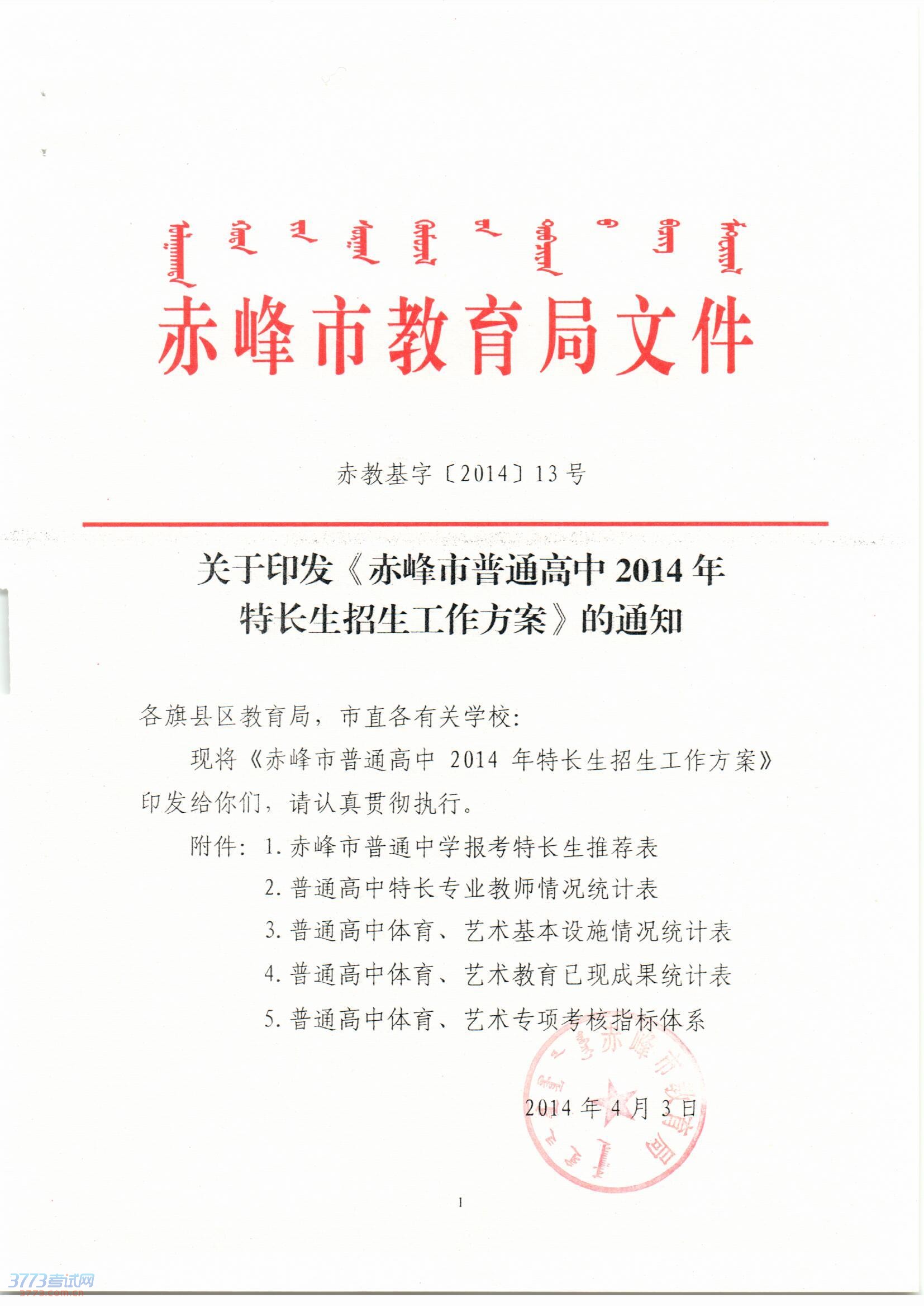 关于印发《赤峰市普通高中2014年特长生招生工作方案》的通知
