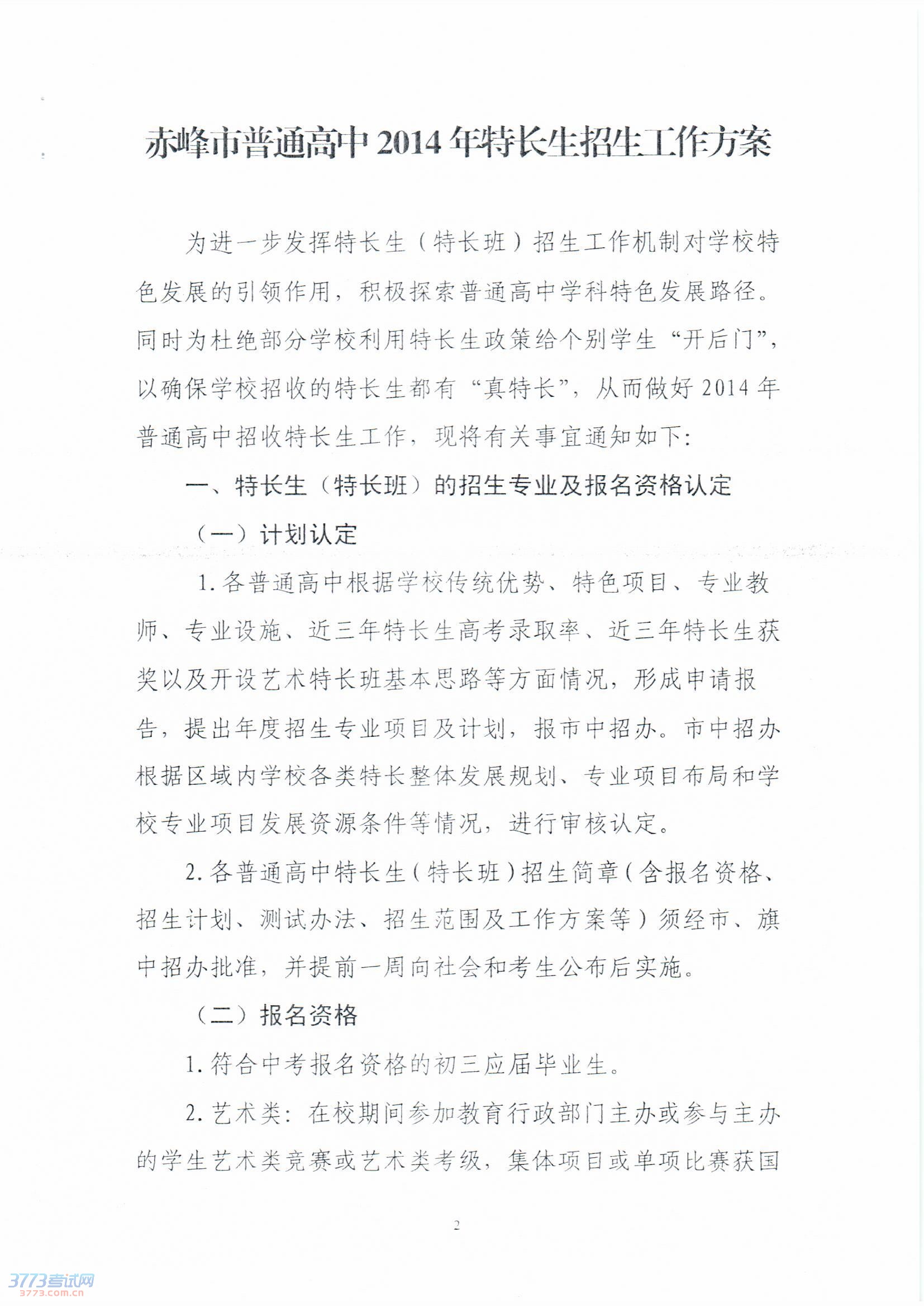 2014赤峰市普通高中特长生招生工作方案