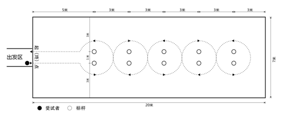 场地设置在篮球场内或者平整的塑胶场地上。设置要求如下:长20米,宽7米。起点线前5米处开始设置标志杆,共设5排,每排2根;各排标志杆之间相距3米,同排的两根标志杆底座中心点之间相距1米,距同侧边线3米。起点线中间1米处为出发区域。设置方式如图所示: