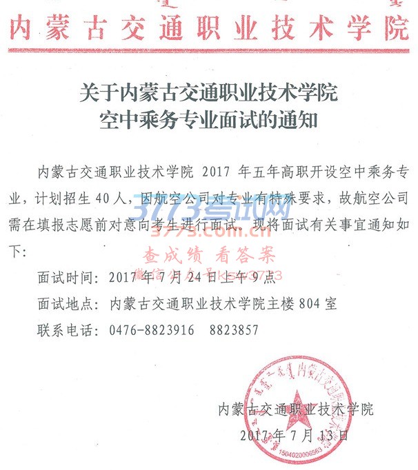 内蒙古交通职业技术学院空中乘务专业面试的通知