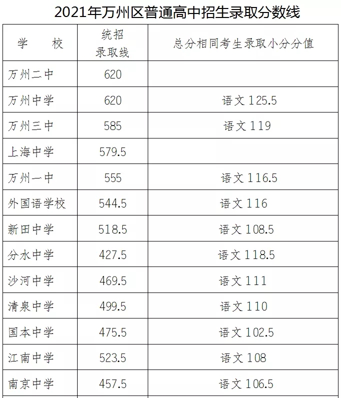 2021万州三中上海中学万州一中录取分数线