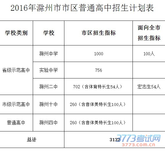 2016年滁州市市区普通高中招生计划表