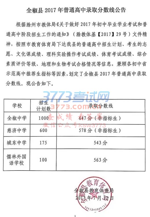 2017全椒中学 慈济中学 城东中学 儒林外国语学校录取分数线