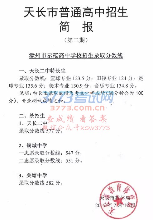 2017年天长市普通高中招生省示范高中学校招生录取分数线
