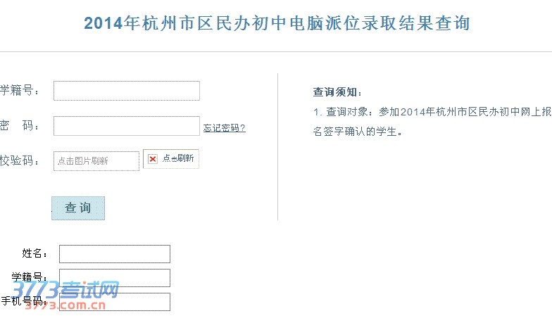 杭州市区民办初中网上报名系统2014年杭州市区民办初中电脑派位录取结果查询 学籍号: 密 码: 忘记密码? 校验码: 查询须知:1. 查询对象:参加2014年杭州市区民办初中网上报名签字确认的学生。 姓名 性别 班级 学籍号 联系手机号码 学校 身份证 姓名: 学籍号: 联系手机号码: