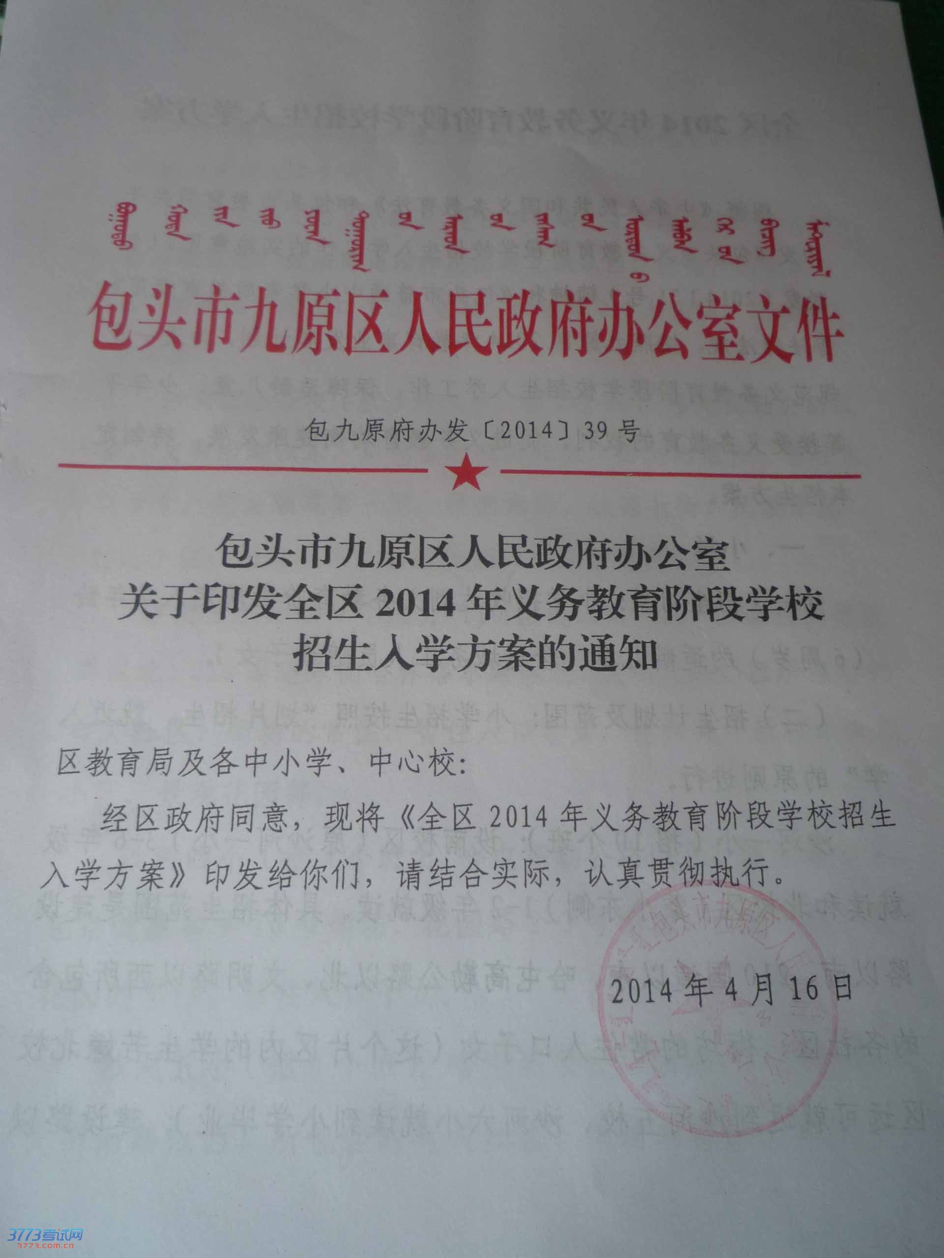 包头市九原区人民政府办公室关于印发全区2014年义务教育阶段学校招生入学方案的通知