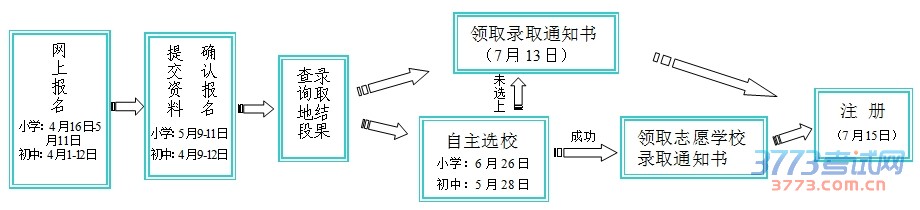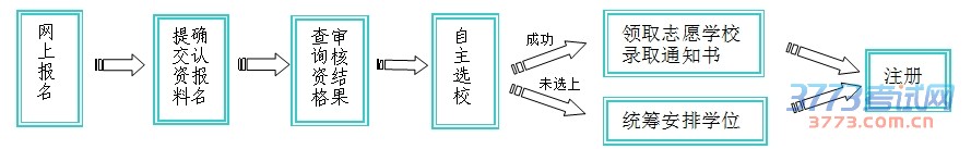 网上报名、提交报名资料、自主选校(根据意愿自愿参与)、领取录取通知书、注册;