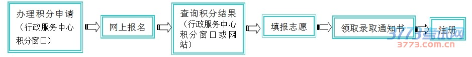 到镇(街)行政服务中心窗口办理新市民积分申请 、网上报名、查阅新市民积分审核结果、获得学位资格者填报志愿、领取录取通知书 、注册。