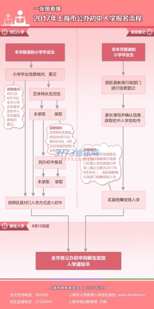 今年,我们会将本市小学五年级在籍学生学籍信息直接导入“上海市义务教育入学报名系统”。4月1日—10日,小学五年级学生家长需在学生就读小学核对关键信息(户籍地址、居住地地址),并填写家长手机号码(作为家长接收初中入学信息的联系方式)。如发现有关信息与实际情况不符的,应在4月10日前凭有效证件到学生就读小学进行更正。4月10日为本市小学五年级学生初中入学关键信息核对、更正截止日。