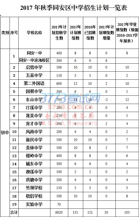 2017年秋季同安区中学招生计划一览表