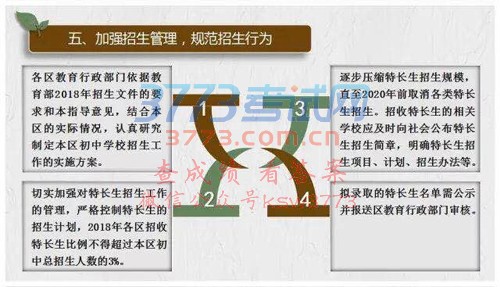 市教委特别要求各区教育行政部门要加强对特长生招生工作的管理,严格控制特长生的招生计划。今年各区招收特长生比例不得超过本区初中总招生人数的3%。要逐步压缩特长生招生规模,直至2020年前取消各类特长生招生。