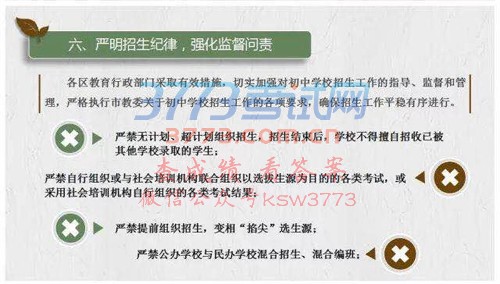各区教育行政部门要采取有效措施,切实加强对初中学校招生工作的指导、监督和管理,严格执行市教委关于初中学校招生工作的各项要求,确保招生工作平稳有序进行。严禁无计划、超计划组织招生,招生结束后,学校不得擅自招收已被其他学校录取的学生;严禁自行组织或与社会培训机构联合组织以选拔生源为目的的各类考试,或采用社会培训机构自行组织的各类考试结果;严禁提前组织招生,变相“掐尖”选生源;严禁公办学校与民办学校混合招生、混合编班;严禁以高额物质奖励、虚假宣传等不正当手段招揽生源;严禁任何学校收取或变相收取与入学挂钩的“捐资助学款”;严禁义务教育阶段学校以各类竞赛证书、学科竞赛成绩或考级证明等作为招生依据;严禁义务教育阶段学校设立任何名义的重点班、快慢班;严禁出现人籍分离、空挂学籍、学籍造假等现象,不得为违规跨区域招收的学生和违规转学学生办理学籍转接。