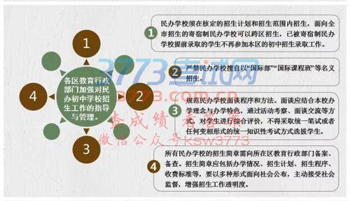 此外,各区教育行政部门要加强对民办初中学校招生工作的指导与管理。一是民办学校须在核定的招生计划和招生范围内招生,面向全市招生的寄宿制民办学校可以跨区招生,已被寄宿制民办学校提前录取的学生不再参加本区的初中招生录取工作。二是严禁民办学校擅自以“国际部”“国际课程班”等名义招生。三是规范民办学校面谈程序和方法。面谈应结合本校办学理念与办学特色,通过活动考察、面谈交流等方式,对学生进行综合评价,不得采取统一笔试或者任何变相形式的统一知识性考试方式选拔学生。四是所有民办学校的招生简章需向所在区教育行政部门备案、备查。招生简章应包括办学情况、招生计划、招生程序、收费标准等,要以多种形式面向社会公布,主动接受社会监督,增强招生工作透明度。