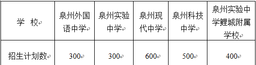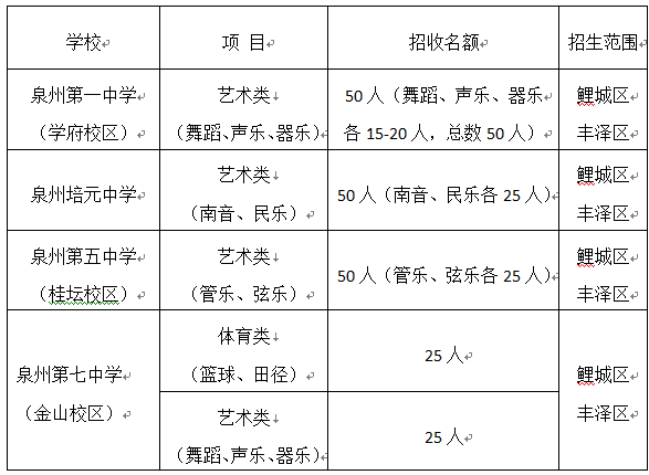 经福建省教育厅确认,泉州一中、泉州培元中学、泉州五中、泉州七中等四所学校初中部,每所面向鲤城区、丰泽区分别招收初中特长生50人。