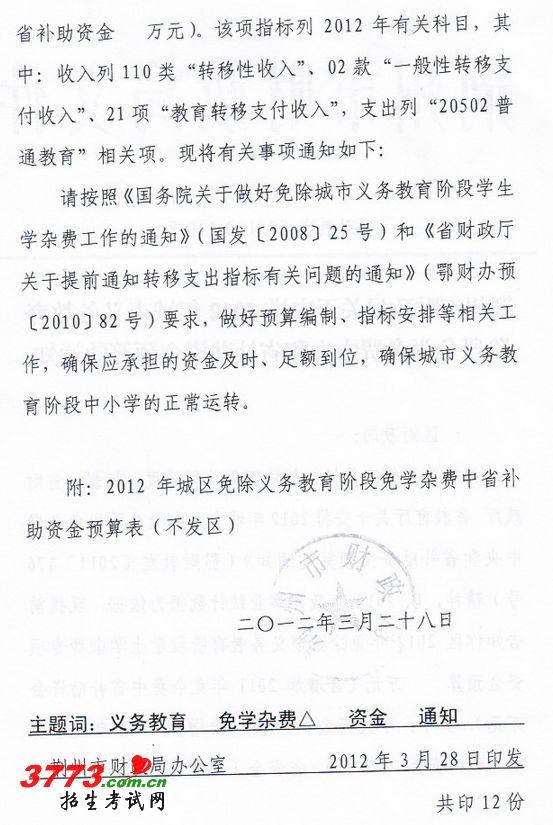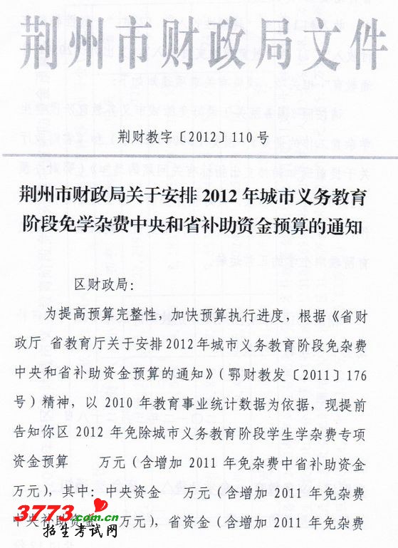 荆州市财政局关于安排2012年城市义务教育阶段免学杂费中央和省补助资金预算的通知