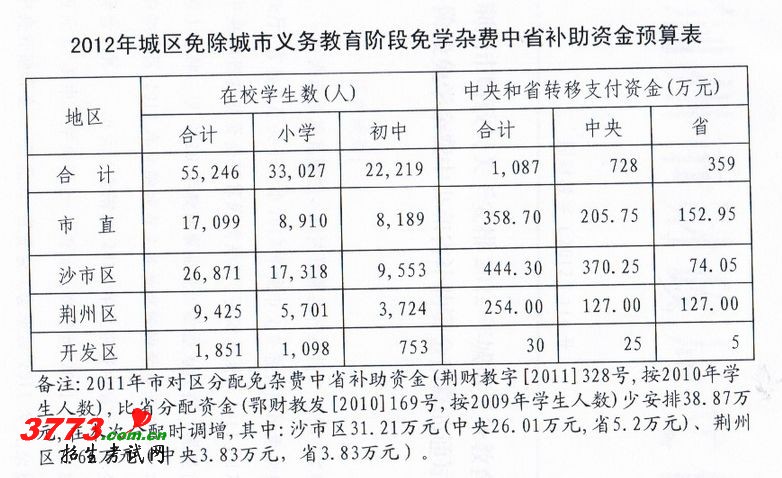 2012年荆州义务教育阶段免学杂费中央和省补助资金预算