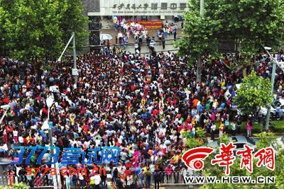 昨日,西安民办学校“小升初”综合素质测评,西安交通大学附属中学门外挤满家长,测评结束后学生排队从人群中艰难穿过 记者闫文青 摄
