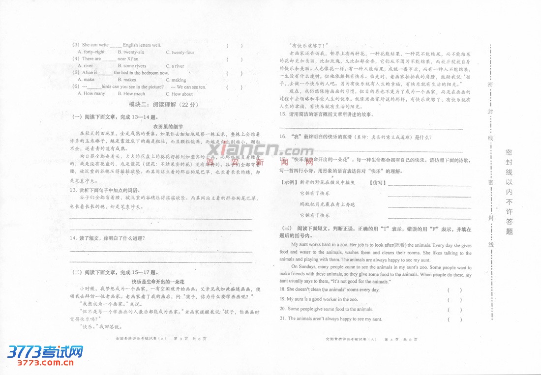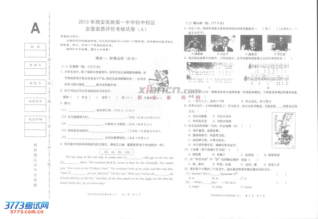 2013年西安小升初高新一中初中校区全面素质评价考核试卷
