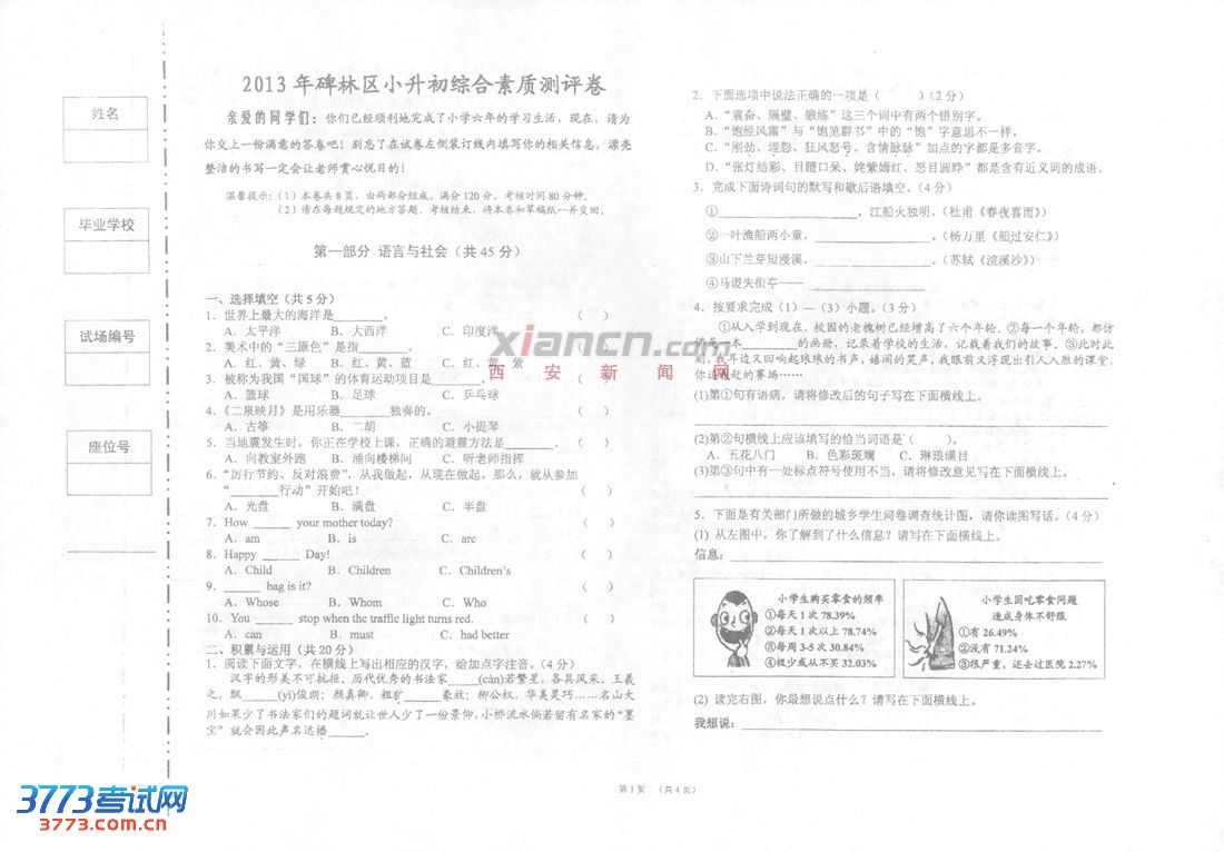 2013西安小升初考试试题难度按6:2:2