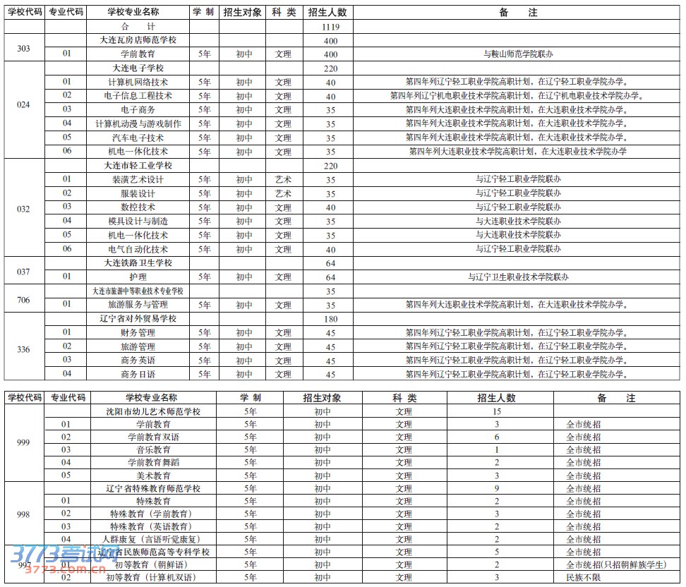 大连市中等职业学校初中起点五年制招生计划表(国家计划)