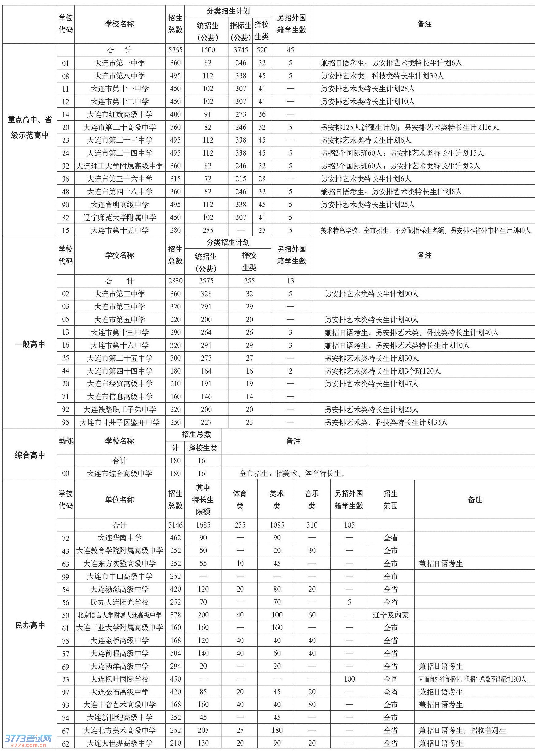 大连市2014年市内普通高中、综合高中及民办高中招生计划