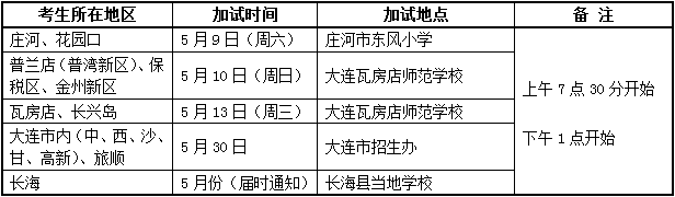 各区、市、县招生办、初中学校: 大连市2015年有四所师范类学校(学院)招收应届初中毕业。现将学校招生具体事宜通知如下,请按照通知精神传达到每所初中学校、每一名考生。一、填报大连瓦房店师范学校,志愿填报在第一批录取批次栏内,由大连市招生办公室统一根据志愿、考试分数和加试合格名单择优录取。报考沈阳市幼儿艺术师范学校,辽宁省特殊教育师范学校,辽宁省民族师范高等专科学校,志愿填报在第三批次录取栏内,由大连市招生办公室统一根据志愿、考试分数和加试合格名单择优录取。二、参加大连瓦房店师范学校组织加试、面试合格的考生,报考沈阳市幼儿艺术师范学校,辽宁省特殊教育师范学校,辽宁省民族师范高等师范学校成绩通用。三、市内五区符合报考条件的考生可与5月30(星期六)日到大连市招生工作办公室一楼大厅参加由招生学校组织的加试、面试。地址:西岗区新华街121号,教师大厦南,市招办电话:84613739.其他区、市、县考生可根据大连瓦房店师范学校和各考区招生办协定的时间组织加试。具体加试时间安排: 工作时间:上午:8:30—11:00,下午:1:00——3:00.四、如有个别考生在规定的日期、时间内没有参加招生学校组织的加试、面试,在考生填报志愿前和招生学校联系补加试、面试。五、各校招生学校以大连市《中招考试信息报》公布的招生专业和计划填报志愿。请招生部门将本通知发到初中学校,初中学校必须指定专人负责此项工作