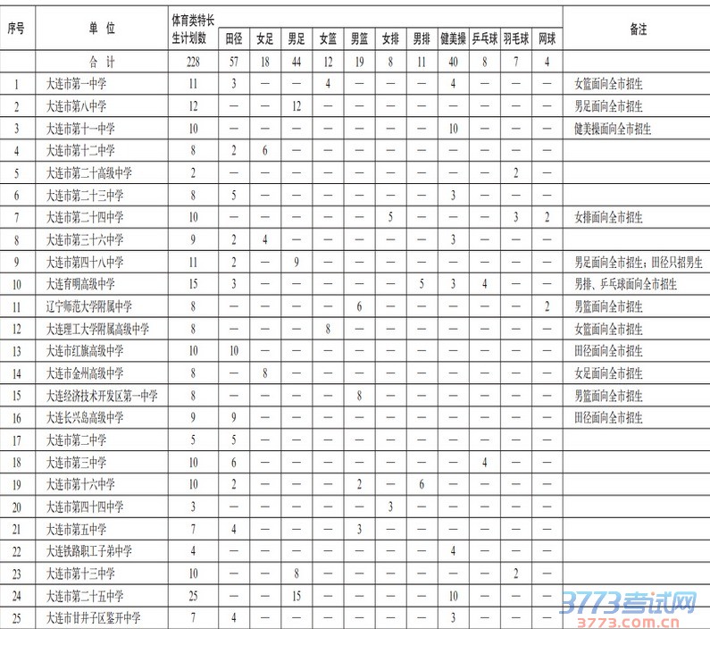 2015年大连市内及跨区域招生高中体育类特长生招生计划