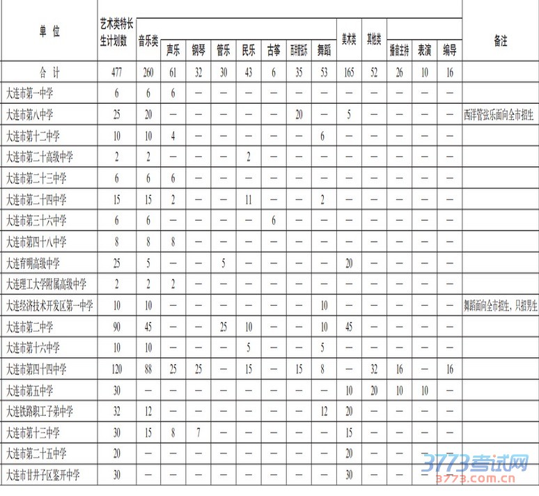 2015大连市内及跨区招生高中艺术类特长生招生计划表