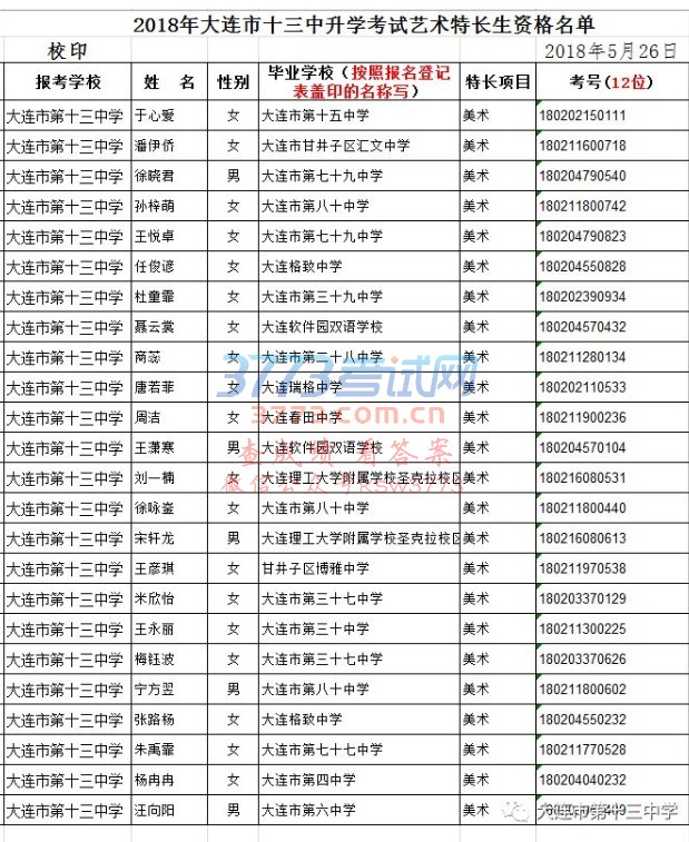 2018年大连市十三中升学考试艺术特长生资格名单(美术)