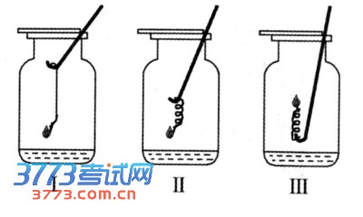54.(4分)如右图所示,取三根粗细、长度均相同的光亮细铁丝,将其中两根分别盘成螺旋状,在每根铁丝一端绑上粗铜丝,另一端系一火柴,点燃火柴,待快燃尽时,分别插入充满氧气的集气瓶中(预先放入一些水。观察到:I、II中铁丝都剧烈燃烧,且II中铁丝燃烧比I中的更剧烈;III中铁丝没有燃烧。