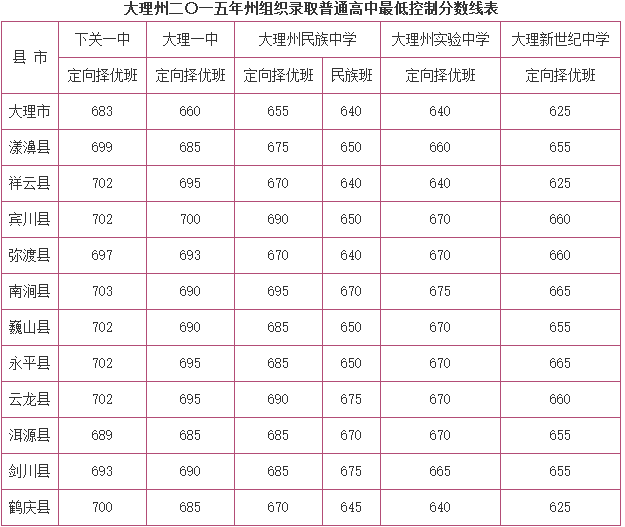 1、录取控制线:①大理州实验中学音乐班最低控制线文化分530分、专业分71分;美术班最低控制线文化分530分、专业分60分。②下关三中音乐班最低控制线文化分510分、专业分61分;美术班最低控制线文化分500分、专业分43分;体育班最低控制线文化分520分、专业分51分。③大理州体育职业中学高中体育班最低控制线文化分400分、专业分30分。