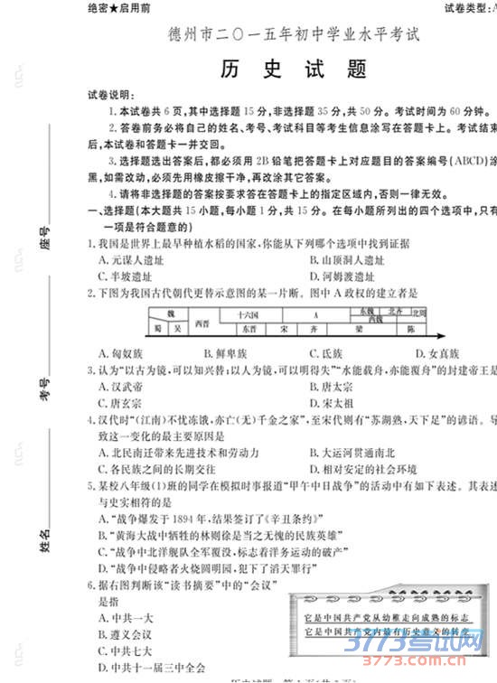 2015德州中考历史试题及答案发布
