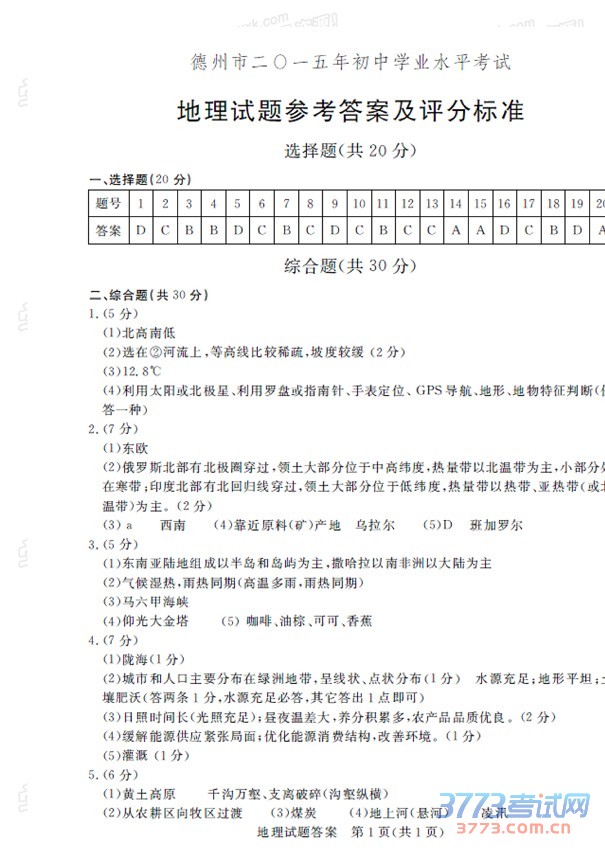 山东中考试题、答案和中考作文。祝各位考生都能取得好的成绩。2015年山东德州中考地理答案(图片版):