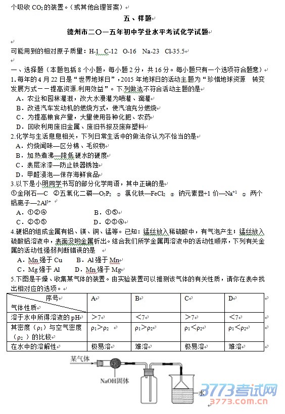 5.下图是干燥、收集某气体的装置。由实验装置可以推测该气体的有关性质,请你在表中找出相对应的选项。