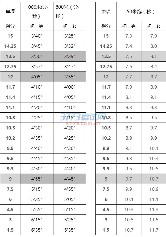 2、1000米(男子)和800米(女子)成绩满分均为15分,测试成绩超过15分按15分计算,不再加分。50米跑成绩满分为15分,测试成绩超过15分按15分计算,不再加分。测试成绩并没有达到最低限的按最低限得分计算,不参加测试或没完成测试的学生不得分。