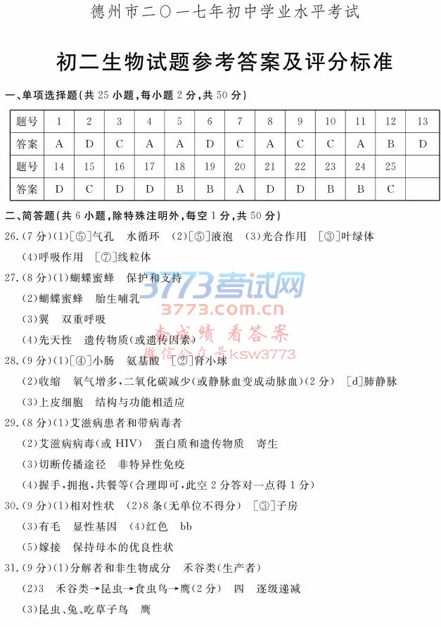生物答案(初二)2017德州初二生物答案及评分标准发布