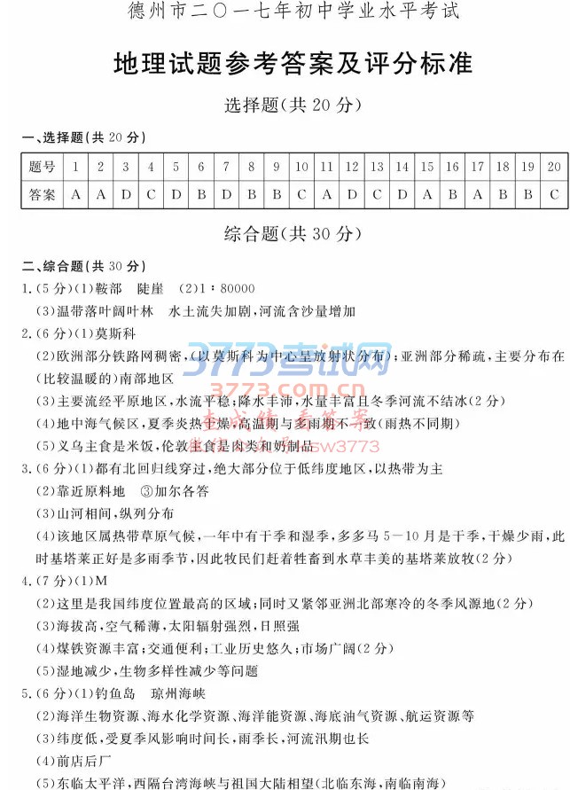 2017德州初二会考地理答案及评分标准发布