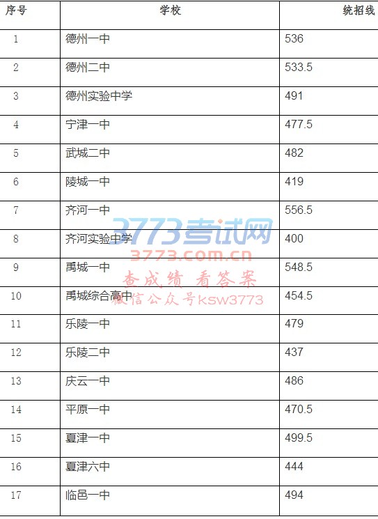 2016年德州市中考各公办高中学校统招分数线 序号学校统招线 1德州一中536 2德州二中533.5 3德州实验中学491 4宁津一中477.5 5武城二中482 6陵城一中419 7齐河一中556.5 8齐河实验中学400 9禹城一中548.5 10禹城综合高中454.5 11乐陵一中479 12乐陵二中437 13庆云一中486 14平原一中470.5 15夏津一中499.5 16夏津六中444 17临邑一中494 注:县市区艺体生由招生高中学校负责录取和解释。