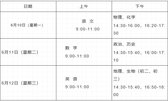 1.考试科目。2016级(初三)考试科目包括语文(含传统文化)、数学、英语(含听力)、物理、化学、道德与法治(含安全常识)、历史、体育、信息技术、理化实验技能10科。2017级(初二)考试科目为地理、生物、生物实验技能(2016级考生可申请参加地理、生物重考,取最好等级计入中考)。