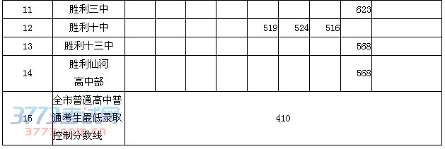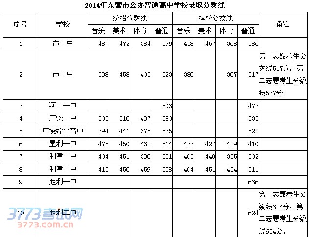 普通考生的统招录取分数线中,市一中最高,为596分;其次为广饶一中,580分;河口一中最低,为503分。