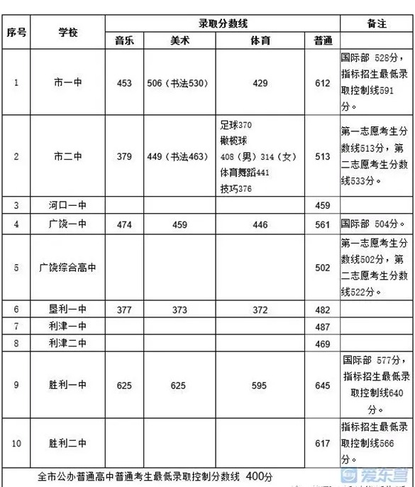 另外,市二中普通考生录取分数线为513分,河口一中普通考生录取分数线为459分,广饶一中普通考生录取分数线为561分,广饶综合高中普通考生录取分数线为502分,垦利一中普通考生录取分数线为482分,利津一中普通考生录取分数线为487分,利津二中普通考生录取分数线为469分,市胜利二中普通考生录取分数线为617分。市一中、市二中、广饶一中、垦利一中、市胜利一中5所学校音体美特长生的录取分数也已公布,最高625分,最低314分。