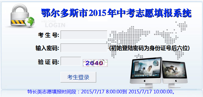 2015年内蒙古鄂尔多斯中考志愿填报系统(特长生)已于7月17日8:00开通,填报时间只有1.5小时,请各位考生登录“鄂尔多斯教育网”填报中考志愿,小编在此祝各位考生都能进入自己心仪的学校!