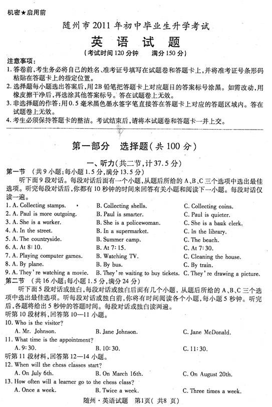 黄冈、随州、鄂州三市联考,英语科试题相同