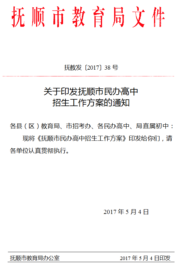 2017抚顺市民办高中招生工作方案的通知