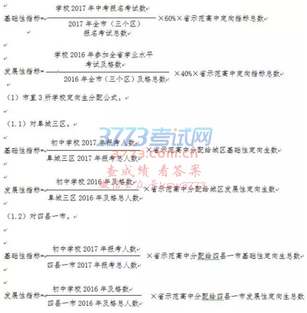 2017年阜城三区的定向生指标由基础性指标和发展性指标两部分组成,比例为6:4。其中基础性指标分配依据为2017年该校参加中考的实际人数,发展性指标依据2016年该校参加全省初中学业水平考试的及格率(总分的60%)。