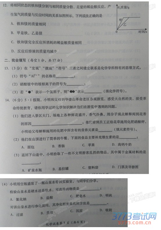 2015广安中考化学试题免费版